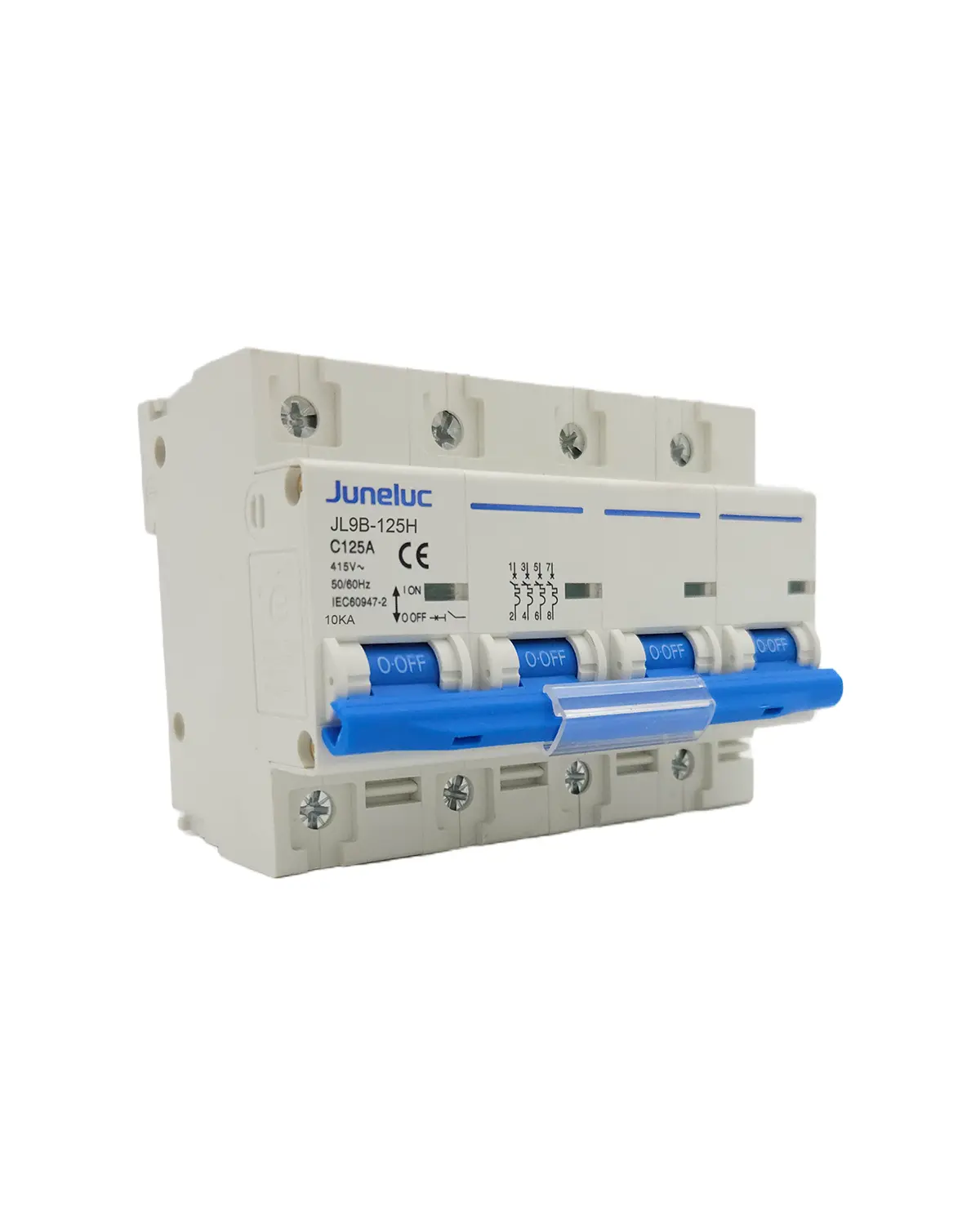 The JL9B-125H circuit breaker from Juneluc is designed to protect lighting and power distribution systems from overloads and short circuits. It is suitable for AC 50Hz/60Hz circuits with a rated voltage of up to 415V.