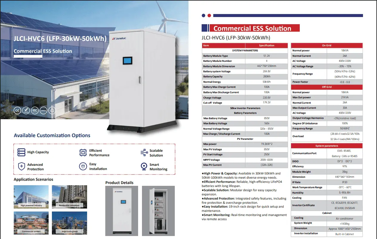 The JLCI-HVC6 (LFP-30kW-50kWh) is a comprehensive Commercial ESS Solution designed for efficient energy management in industrial and commercial sectors. This all-in-one system features a 30kW inverter and a 50kWh lithium iron phosphate (LiFePO4) battery capacity, providing high power and capacity in a scalable, modular design.