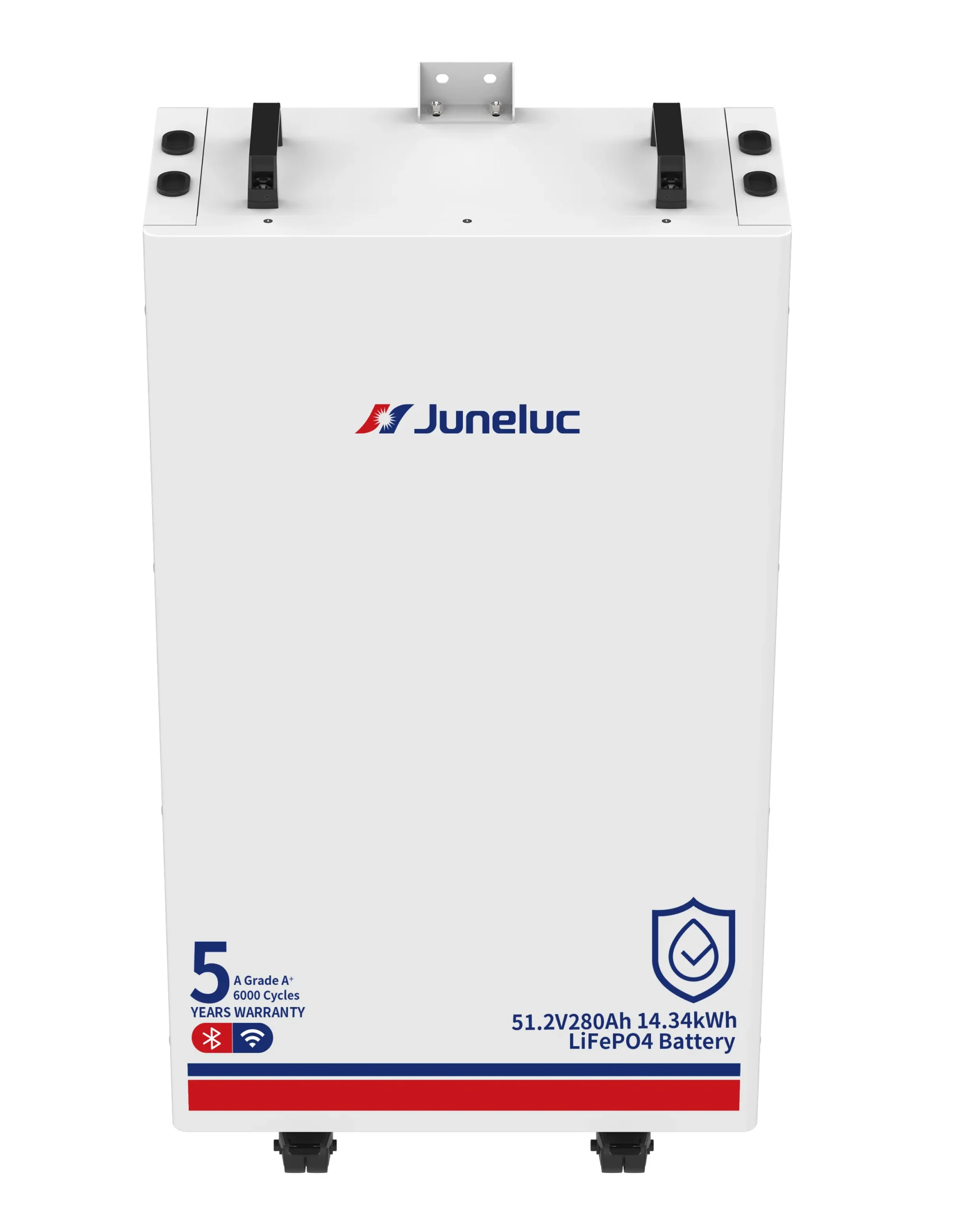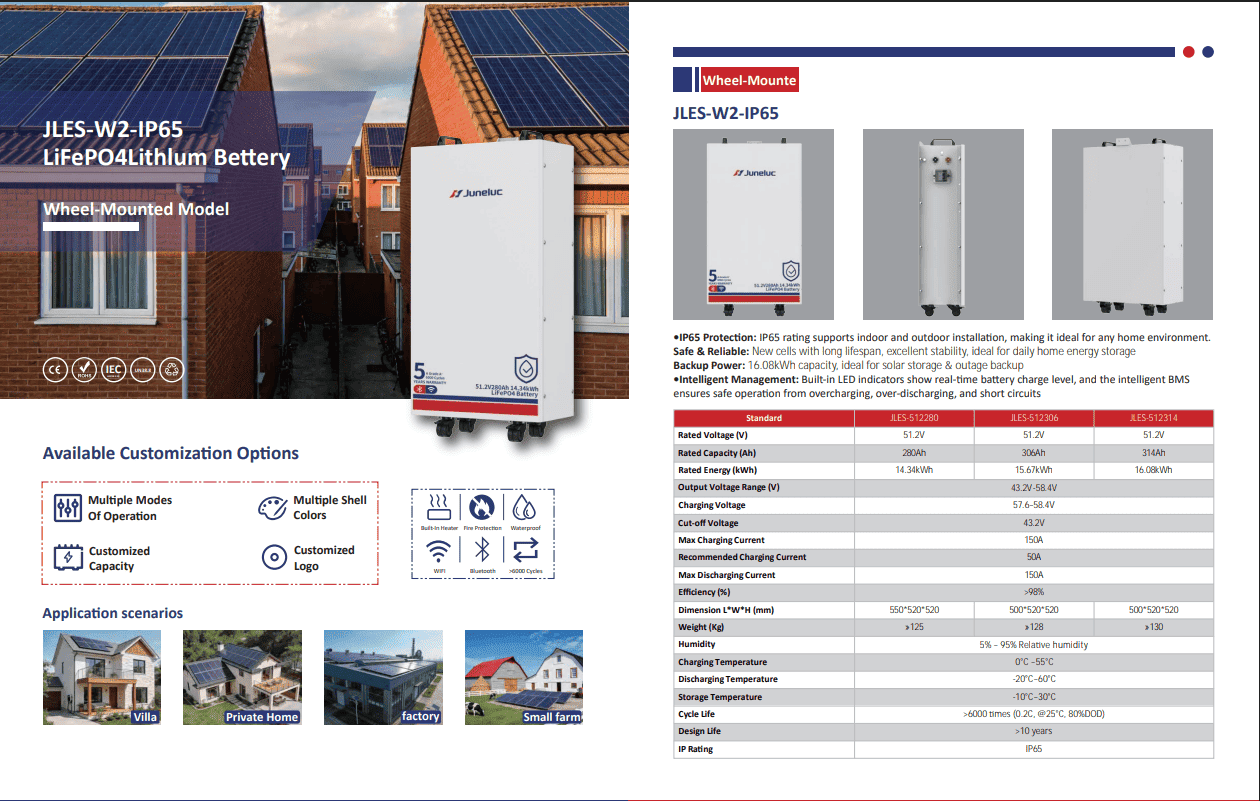 All-Weather Energy Reliability. The Juneluc JLES-W2-IP65 Series is a rugged, wheel-mounted 51.2V LiFePO4 battery system engineered for both indoor and outdoor environments. With a professional IP65 protection rating and capacities up to 16.08kWh, it provides the ultimate backup power solution for homes, farms, and industrial sites prone to varied weather conditions. Featuring intelligent BMS management, integrated fire protection, and over 6000 cycles, this series ensures long-term, high-efficiency energy independence.